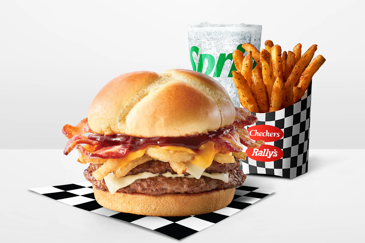 Checkers & Rally’s introduces the new T-Pain Cheesy Bacon BBQ Buford! Two large hand-seasoned all- beef patties stacked up with melty Swiss cheese, crispy onion tanglers, melted cheddar cheese, 3 strips of bacon and smoky BBQ sauce all on a toasted bakery style bun.